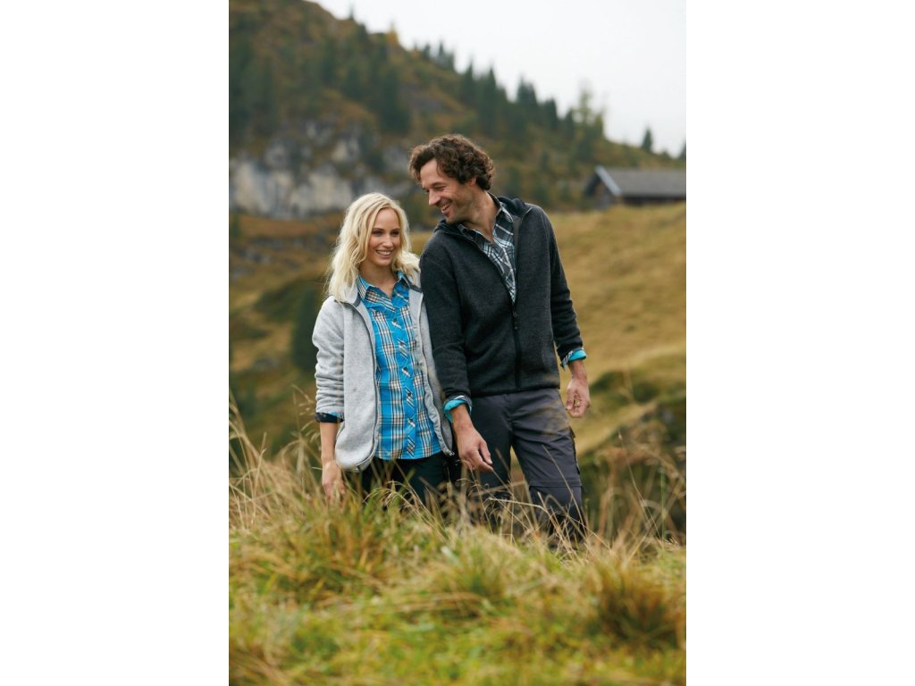 Dámská bunda z pleteného fleecu v melírovaném vzhledu. Hladký, hřejivý, snadno udržovatelný materiál. Vnější strana v pleteném vzhledu, uvnitř zdrsněný, měkká a nadýchaná. Slim-fit dělící švy, zdůrazňující ženskou postavu. Mikina má setřihávanou kapuci. Manžety jsou v kontrastní barvě. 2 kapsy vpředu. Vypasovaný dámský střih