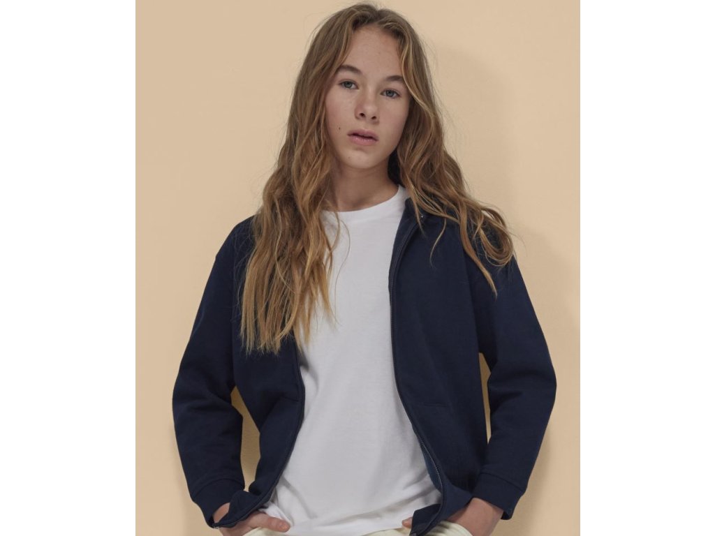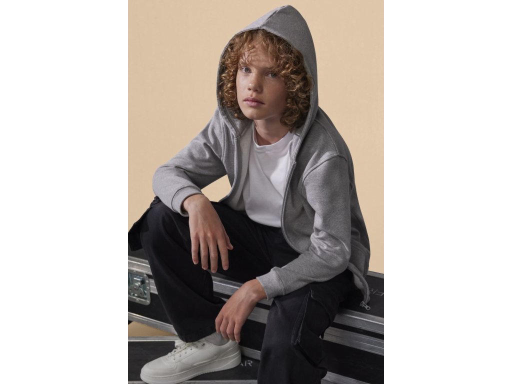Dětská mikina s kapucí a se zipem. Mikina je klasického střihu. Kapuce s podšívkou z jednoduchého žerzeje, 1x1 žebrovaný úplet na rukávech a v pase s elastanem. Mikina má celopropínací zip. Mikina má klokaní kapsu. Ramenní švy odsazené. Povrch mikiny je ze 100% bavlny. Mikina je uvnitř počesaná. Lze sušit v sušičce při nízké teplotě