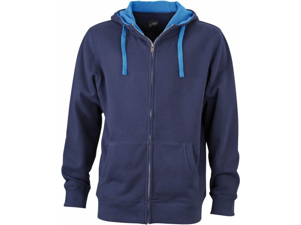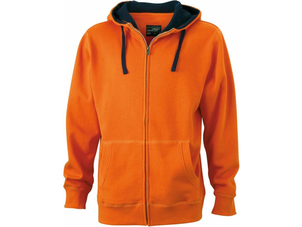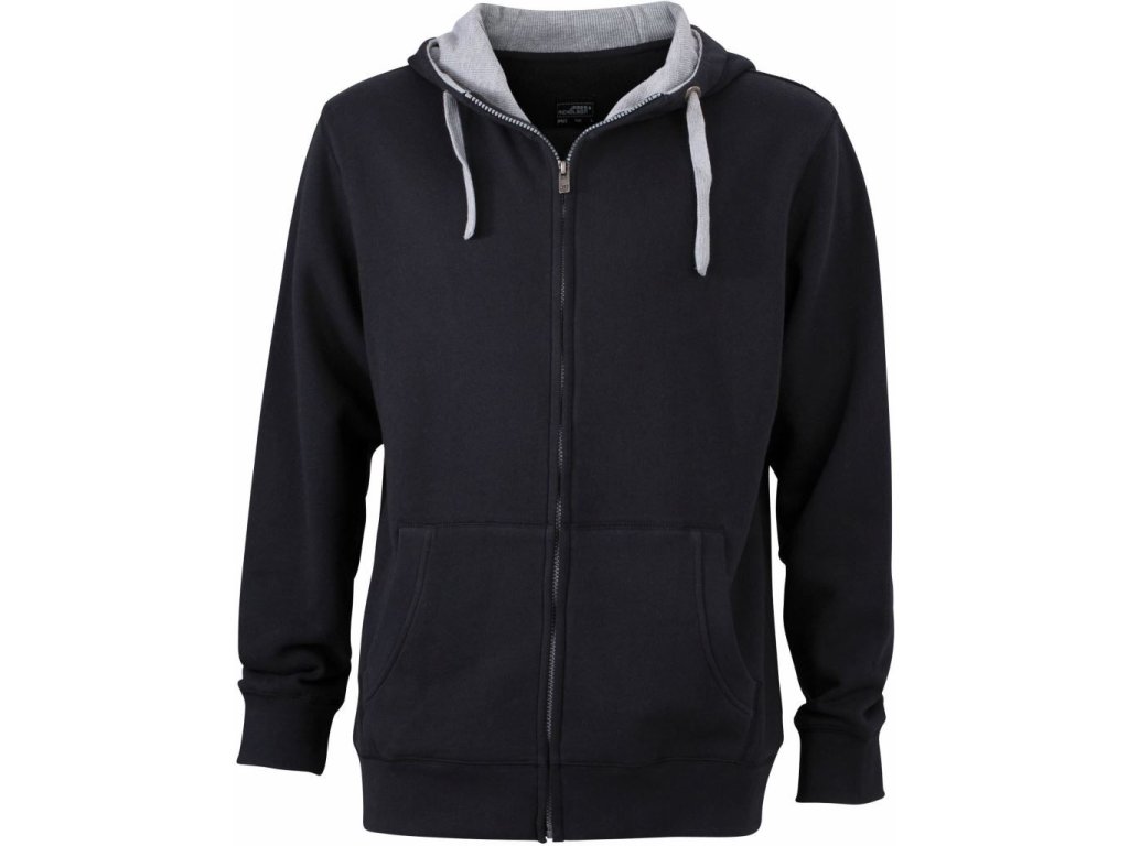 Kvalitní pánská mikina na zip s kapucí. Vysoce kvalitní, měkká tkanina, uvnitř zdrsněná. Manžety s elastanem. Ploché švy v barvě. 2-vrstvá vnitřní kapuce a šnůrky v kontrastní barvě. Klokaní kapsy. Lehce zúžený střih.