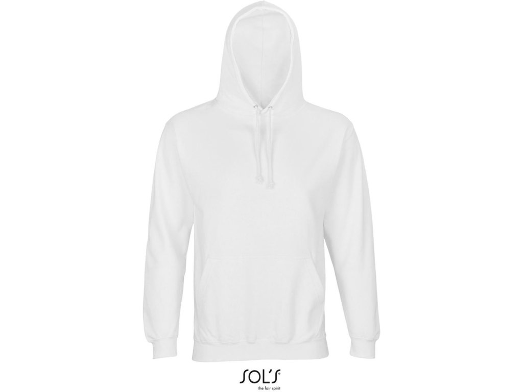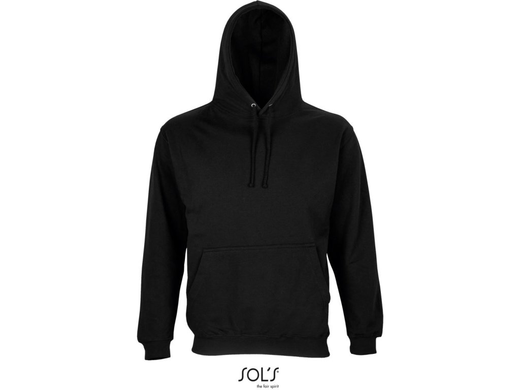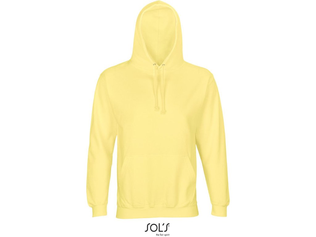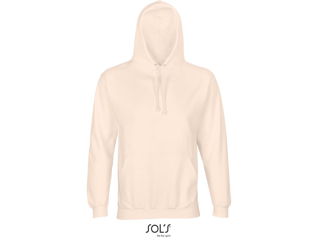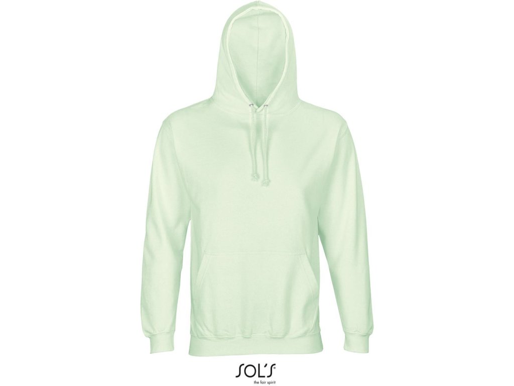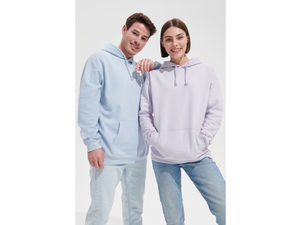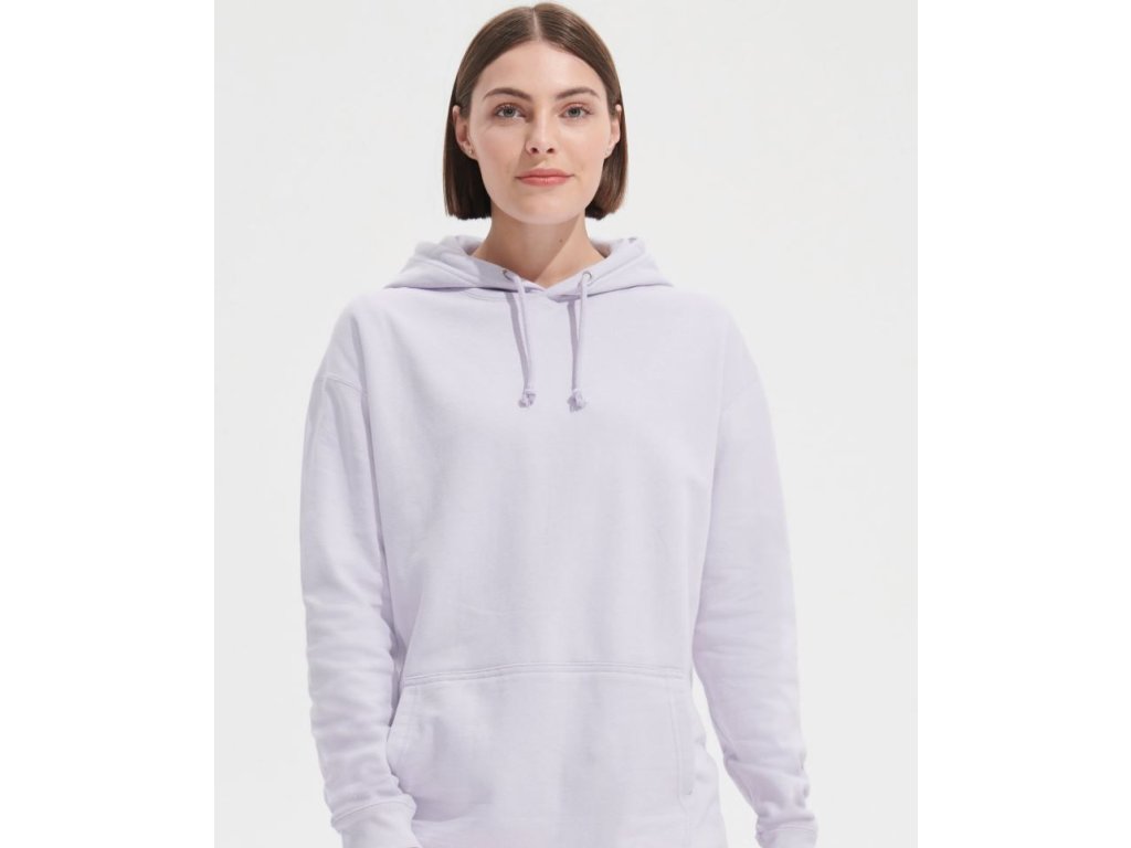Unisex mikina s kapucí v klasickém rovném střihu. Mikina má půlměsícovou posádku na krku a krční lemovku. Rukávy jsou vsazené. Manžety na rukávech a lemu jsou žebrované. Klokaní kapsa. Kapuce je podšitá se šňůrkou a kovovými očky. Mikina je uvnitř počesaná.