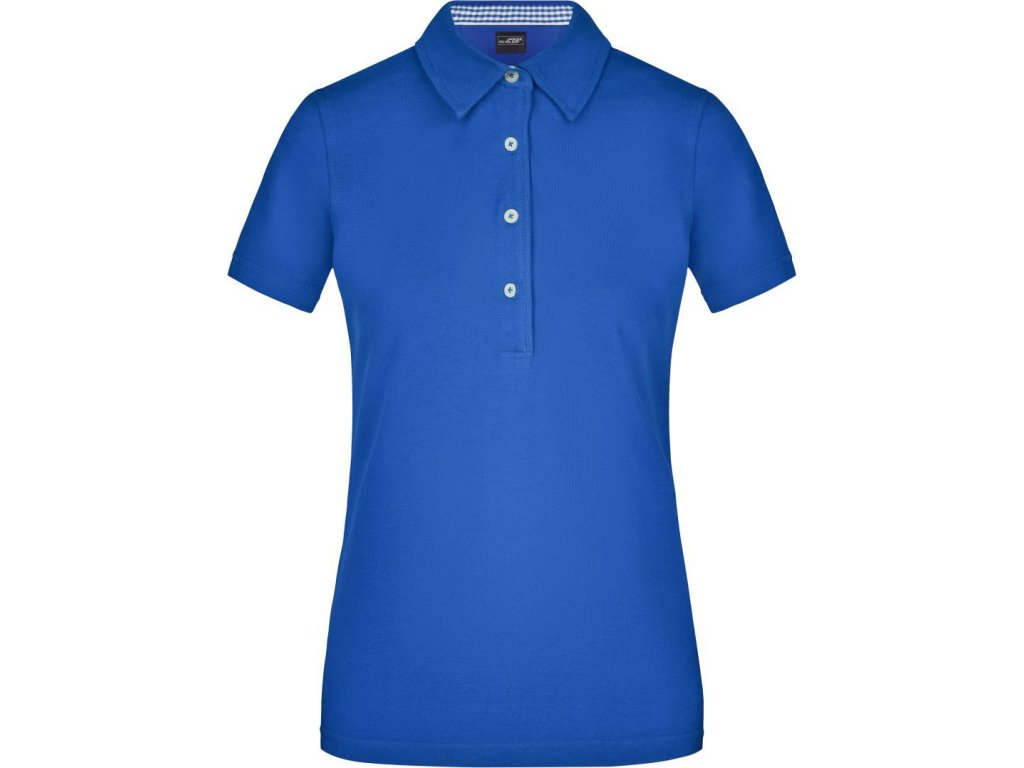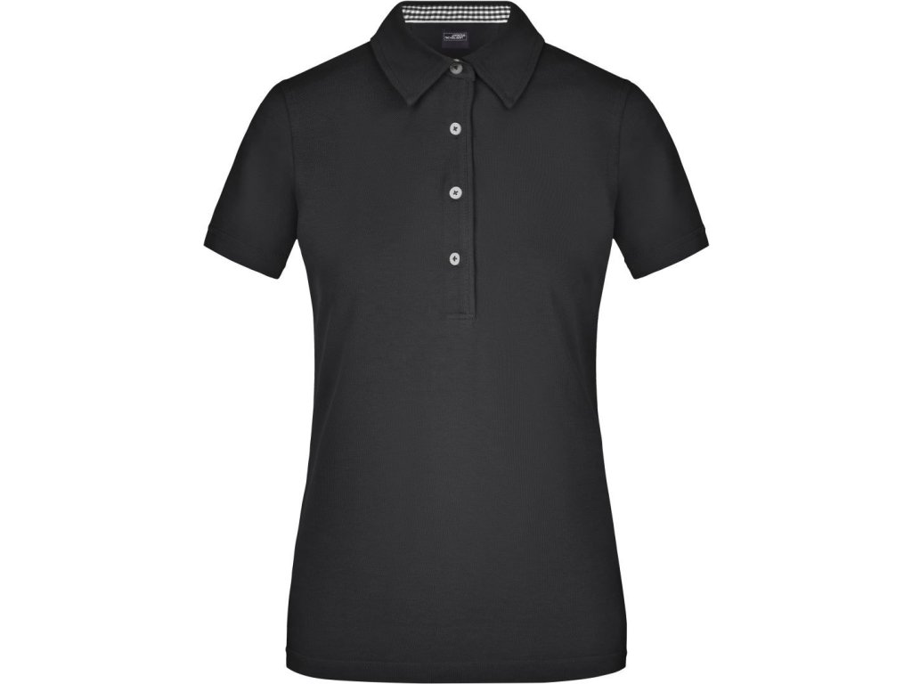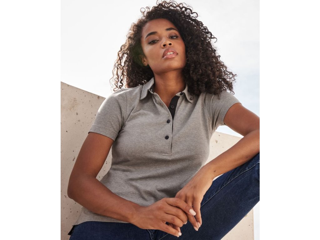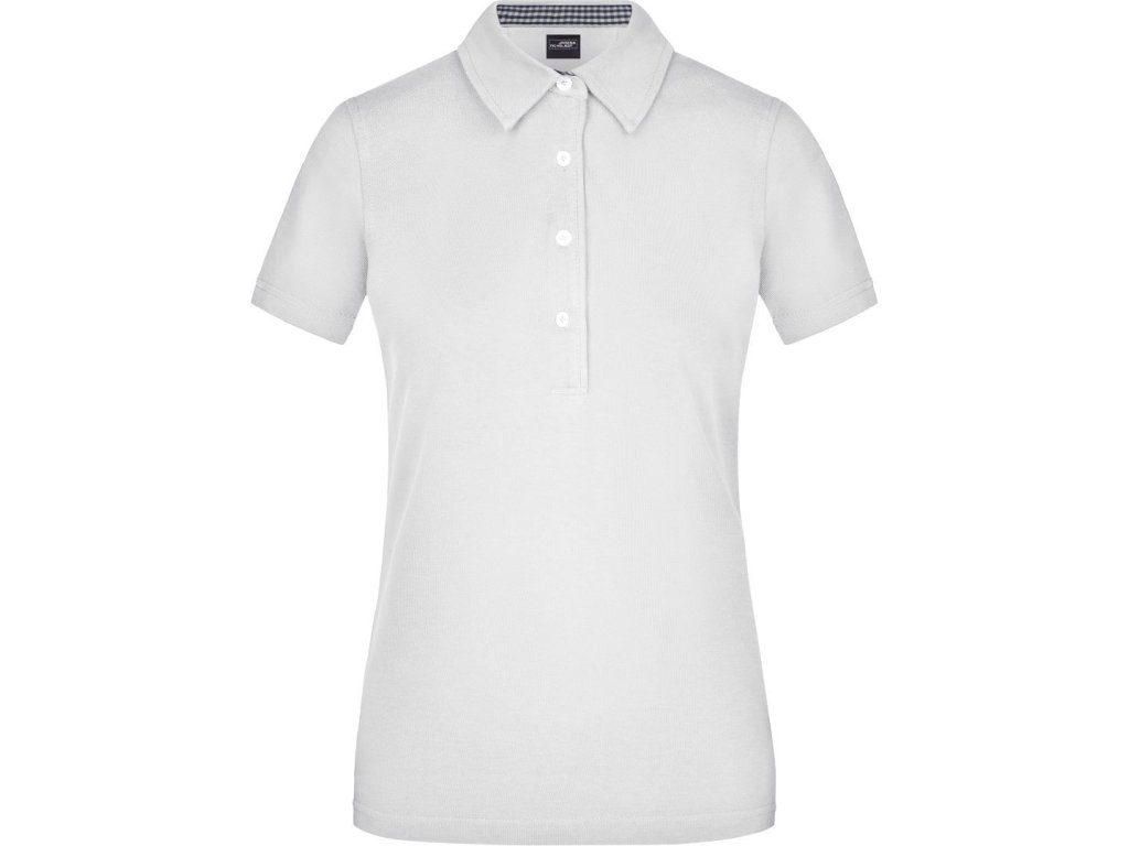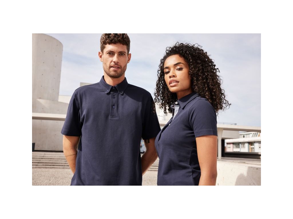 Business dámská polokošile s krátkým rukávem. Módní čtverečkovaný pruh pod knoflíčky ve výstřihu a kolem krku. Velmi jemné piqué. 4 knoflíčky
