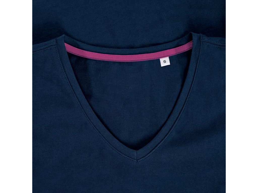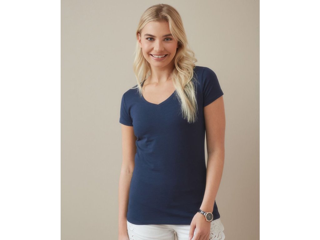 Velmi pěkné dámské vypasované tričko s výstřihem do V. Výstřih je úzce lemovaný. Krční lemovka je v kontrastní barvě. Tričko má zesílený steh na ramenou. Příjemný pružný materiál. Tričko má neutrální velikostní label.