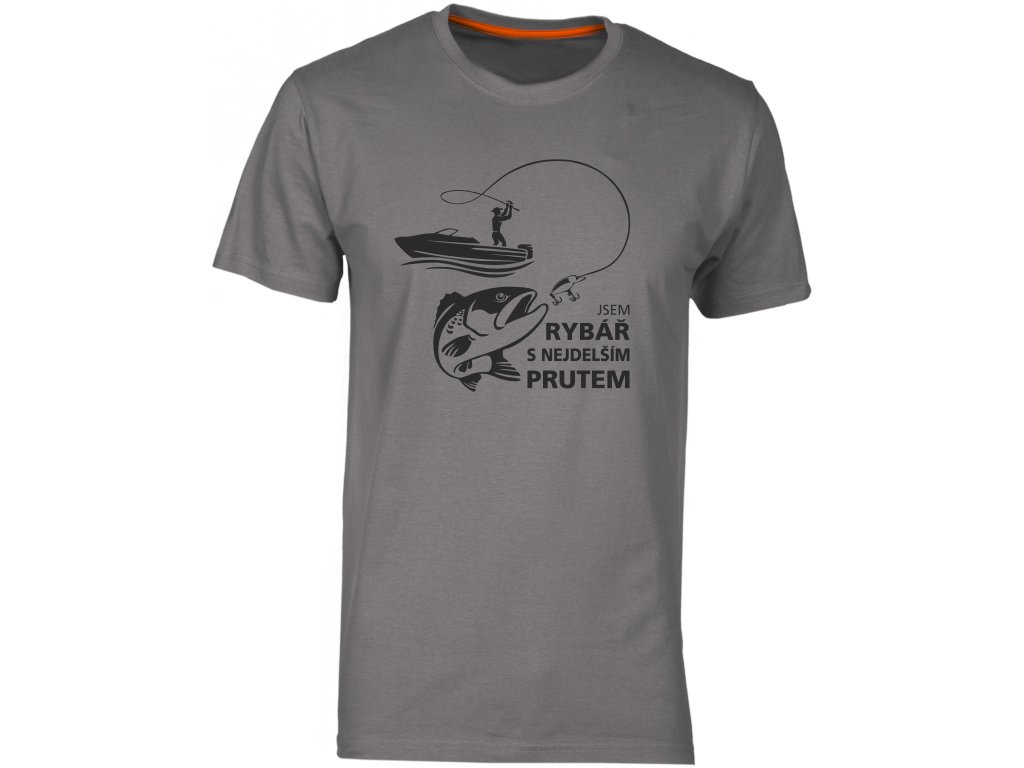 Pánské tričko s potiskem Rybář s nejdelším prutem. Pánské kvalitní tričko. 1,5cm pružný žebrovaný lem u krku s vrchním prošíváním na přední straně, kontrastní výztuž od ramene k rameni viditelná na vnitřní straně krku, pružné švy, postranní švy.