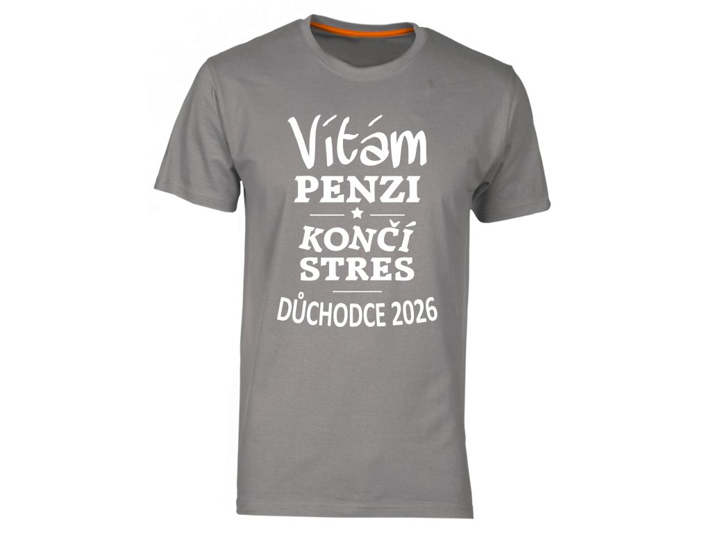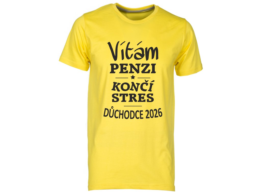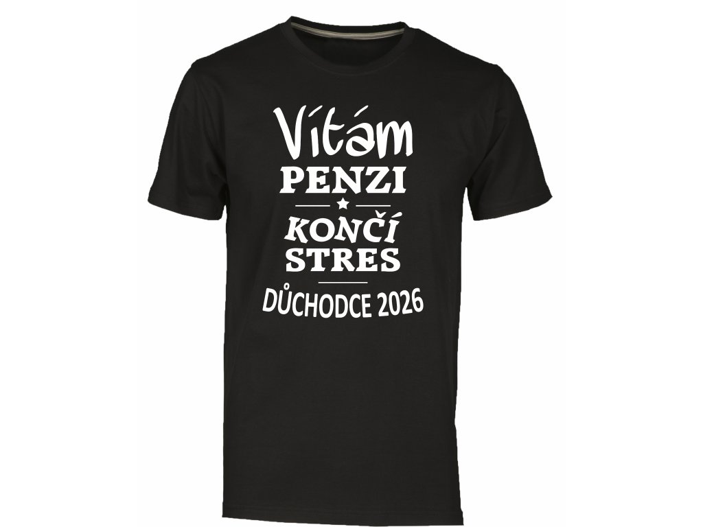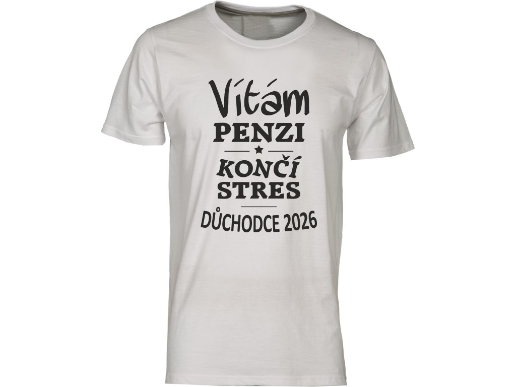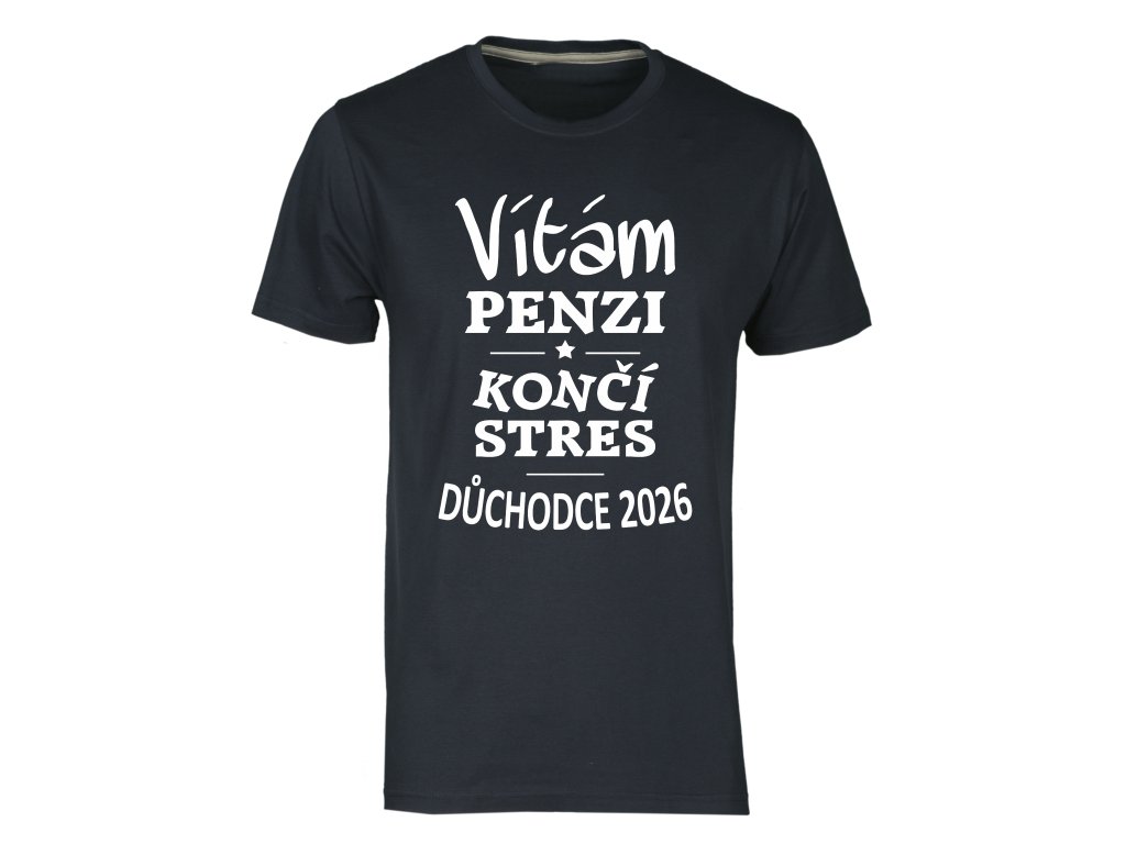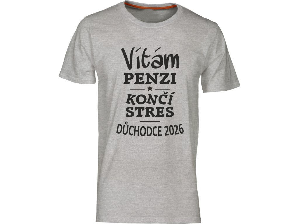 Pánské tričko pro budoucí důchodce s potiskem VÍTÁM PENZI - KONČÍ STRES - DŮCHODCE 2026.
