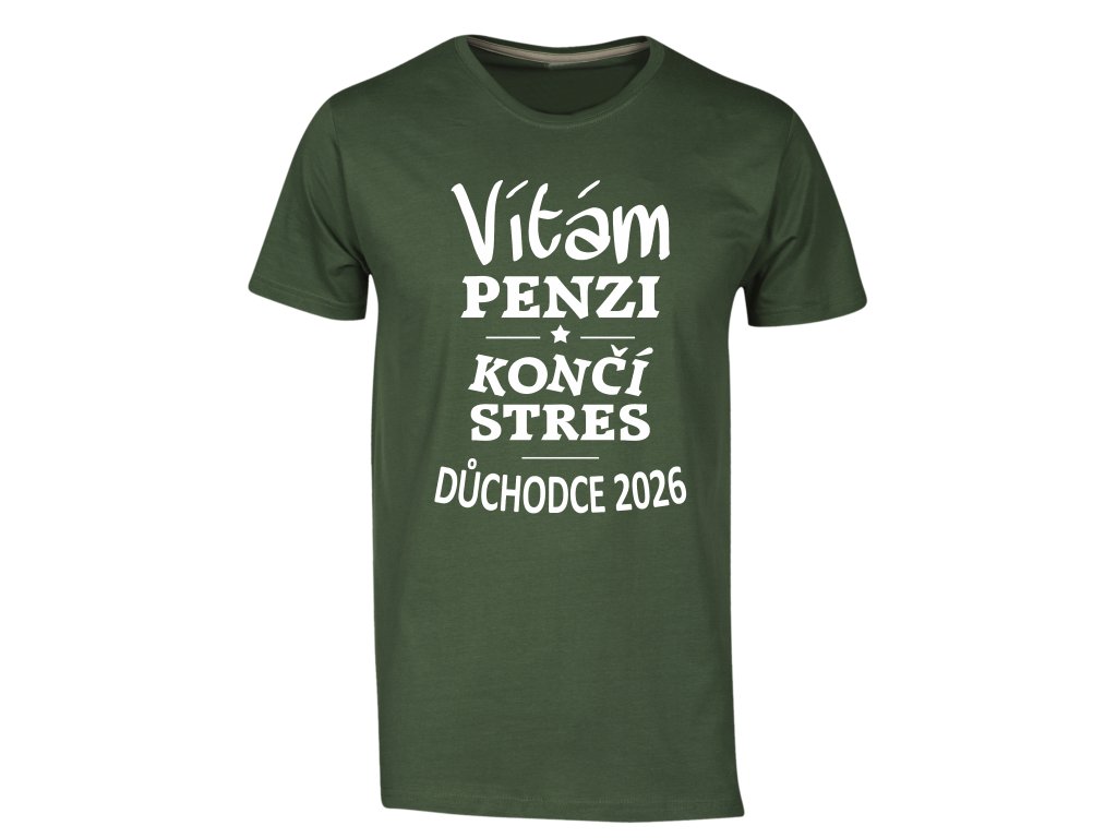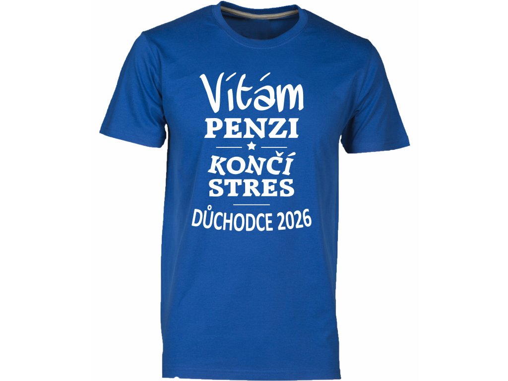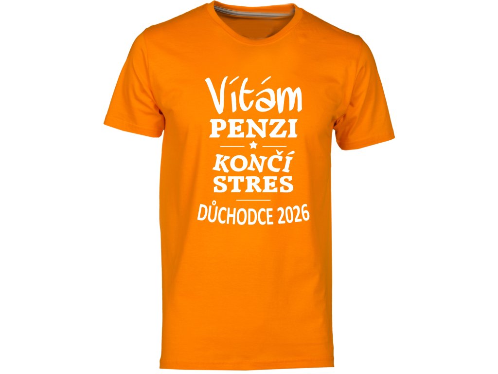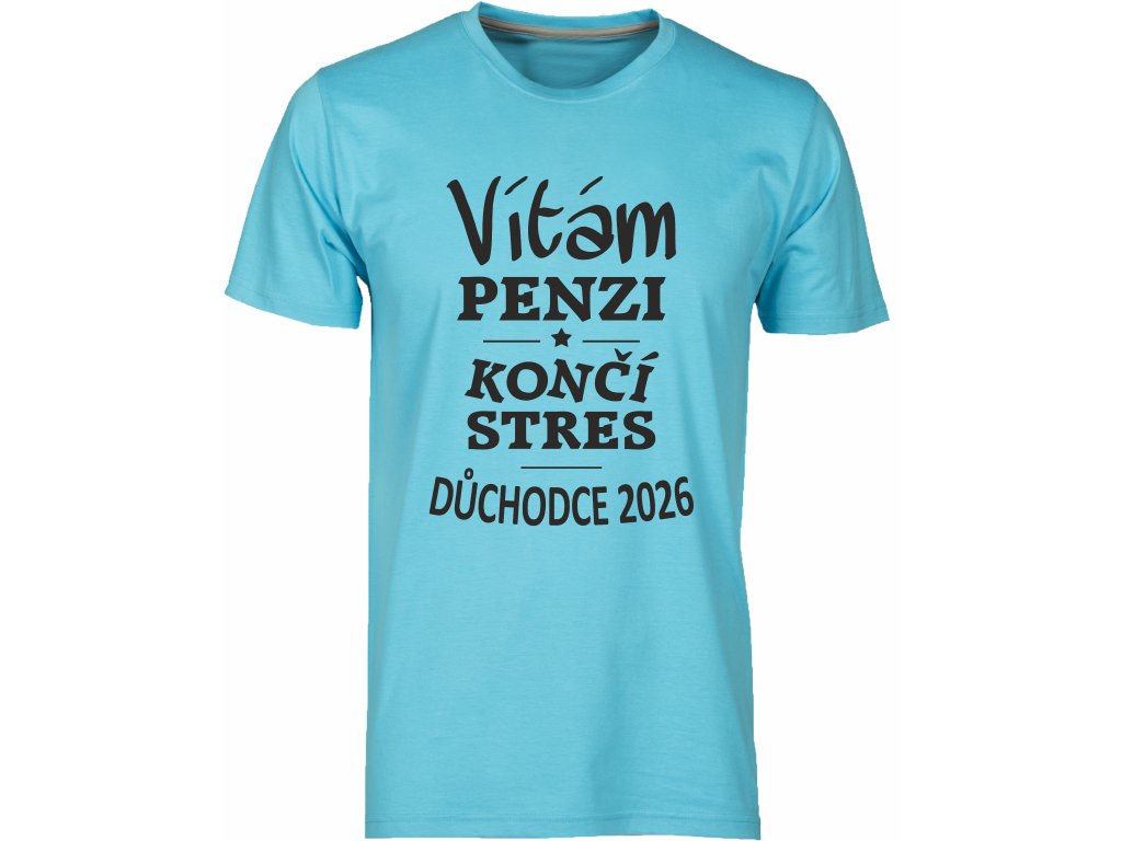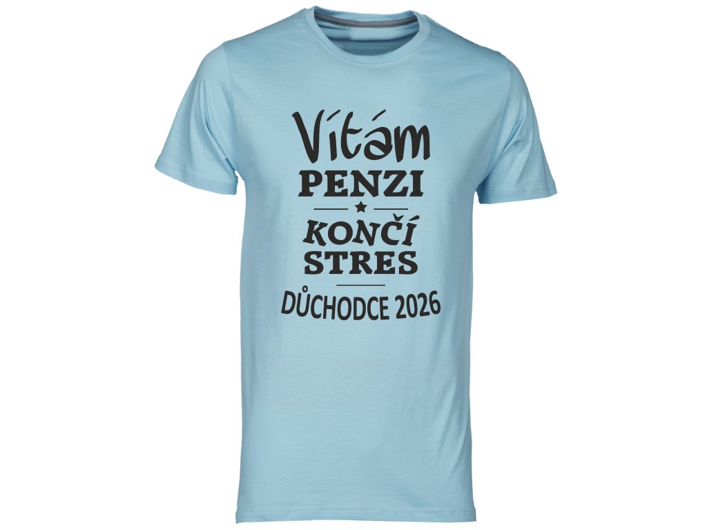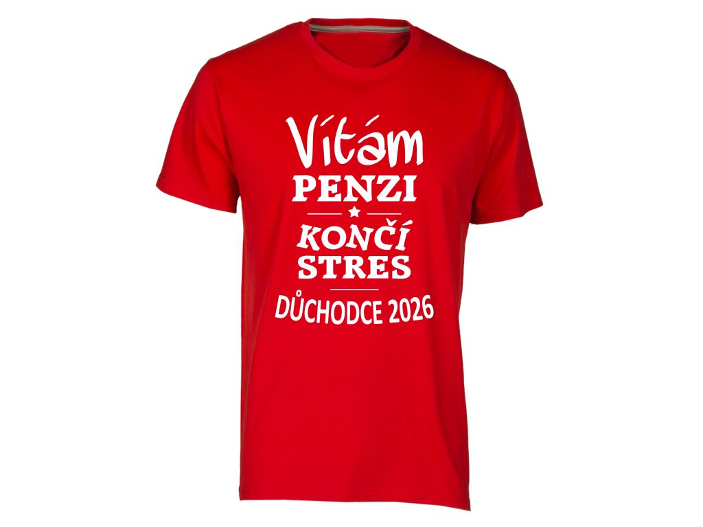 Pánské tričko pro budoucí důchodce s potiskem VÍTÁM PENZI - KONČÍ STRES - DŮCHODCE 2026.